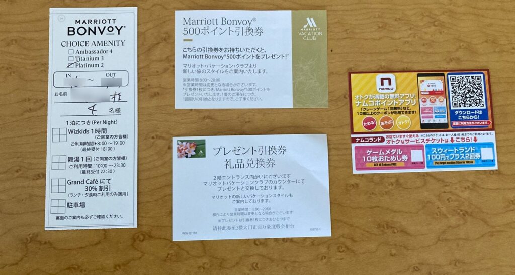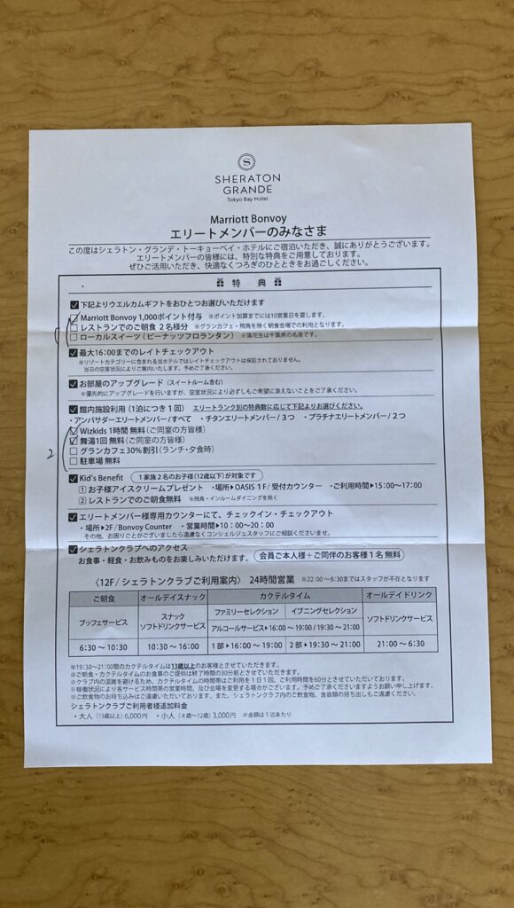 チェックインのときに、マリオットのエリートメンバーにはおなじみの特典の案内が渡されます。